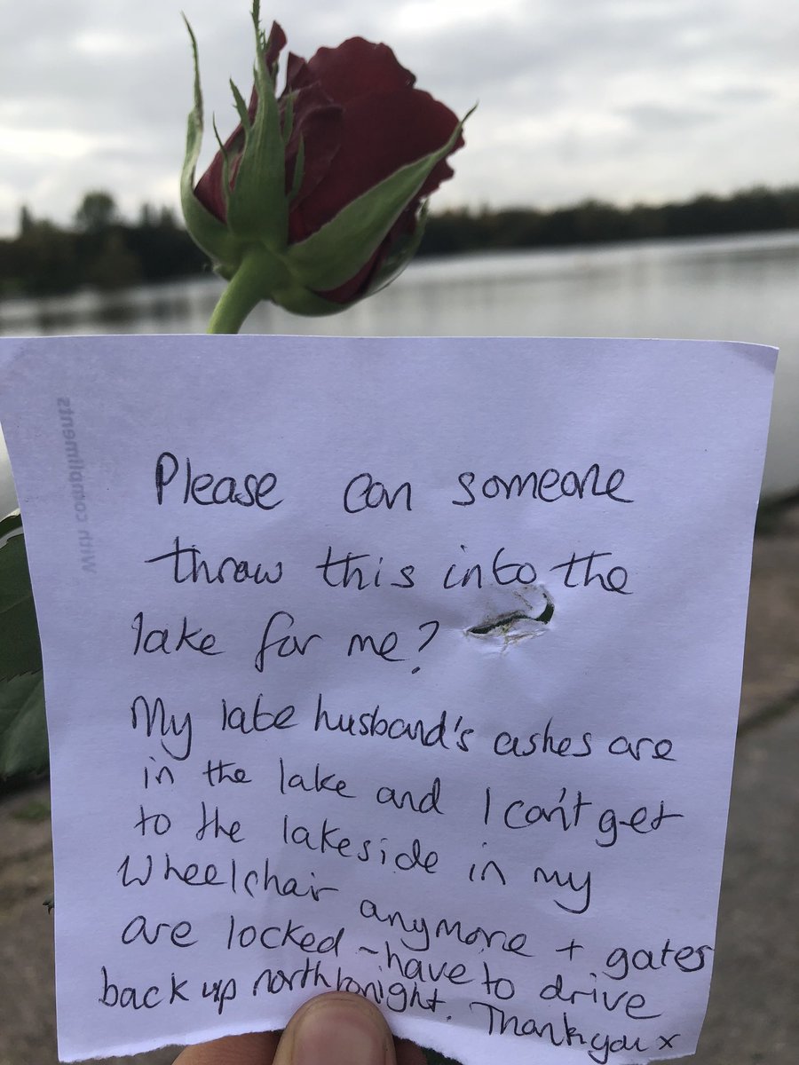 ▼字條內容原來是一名坐輪椅的太太寫下的,「請幫我把這朵玫瑰投進湖裡好嗎?我丈夫的骨灰已灑在湖中,我卻因為坐著輪椅無法接近湖邊,門也關了,再加上我今晚就要北上回家,真的沒辦法只能拜託你了。感謝你。」