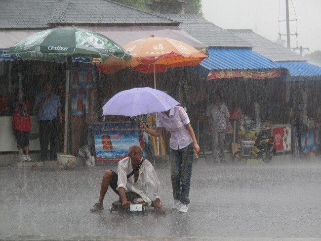 ▼5. 大雨中,一位中國女孩為乞討的老人撐傘。