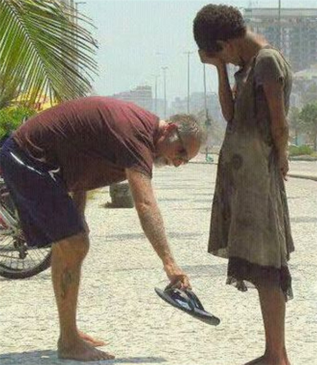 ▼9. 老人將自己的鞋子送給這位貧困的乞丐。