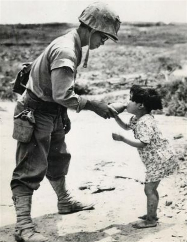 ▼6. 1945年沖繩,一名美國海軍陸戰隊員給在山洞中發現的小女孩餵水。