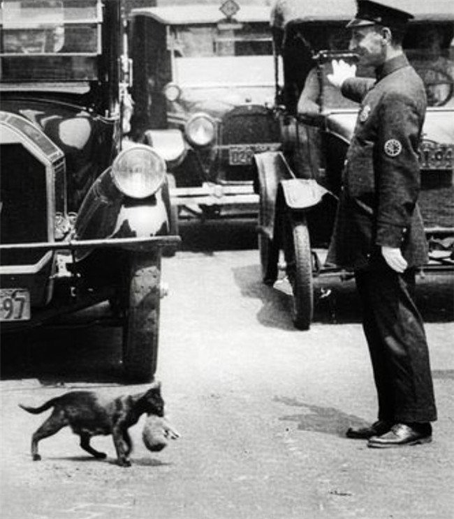 ▼3. 1925年7月,《紐約時報》的攝影師拍下了一名警察攔住車輛,幫助小貓過馬路的照片。