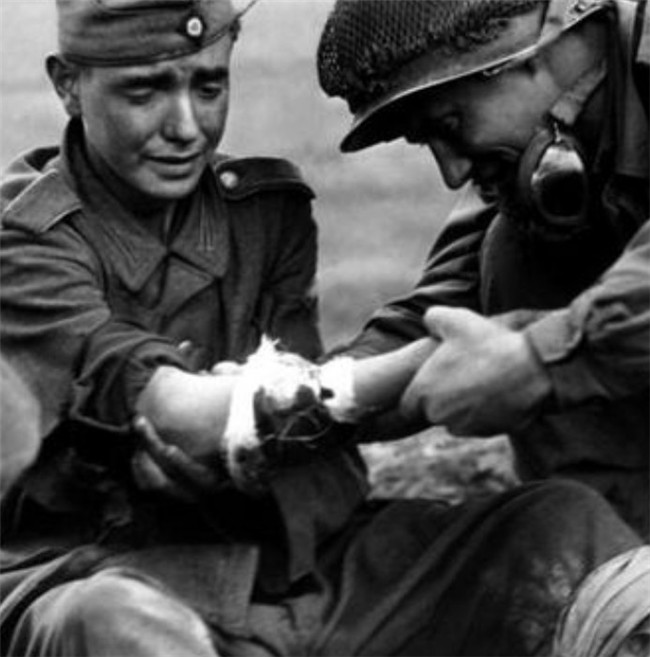▼8. 1944年,一名德國士兵正在接受美國士兵的治療。