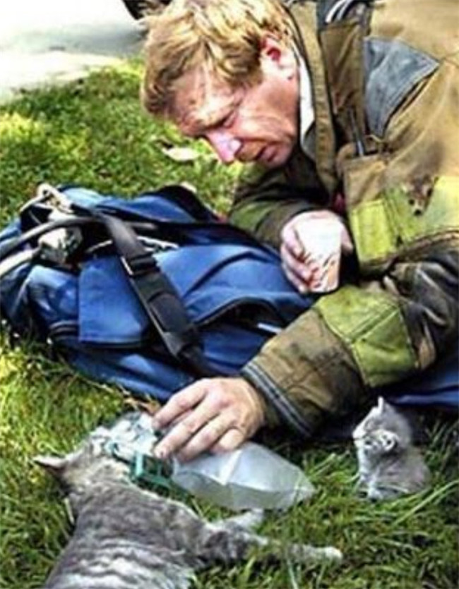 ▼7. 救援人員在搶救戴著呼吸器的貓媽媽,貓寶寶在一旁安靜的看著。