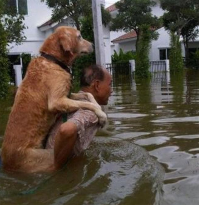 ▼13. 洪水中,泰國男子背著他的大狗。