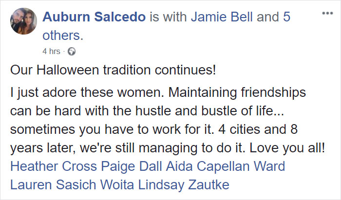 ▼奧本(Auburn Salcedo)在臉書上po文表示:「我們7個閨蜜之間的萬聖節傳統,將會持續下去!我愛極了這些女人了。其實友誼的維持相當不易,很有可能會因為生活中的各種忙碌,而沖淡了這份交情。因此即便我們相隔了4座城市,但我相信在多年之後,我們仍然還是會繼續一起努力,好好將這份得來不易的友情維繫下去!愛妳們~」