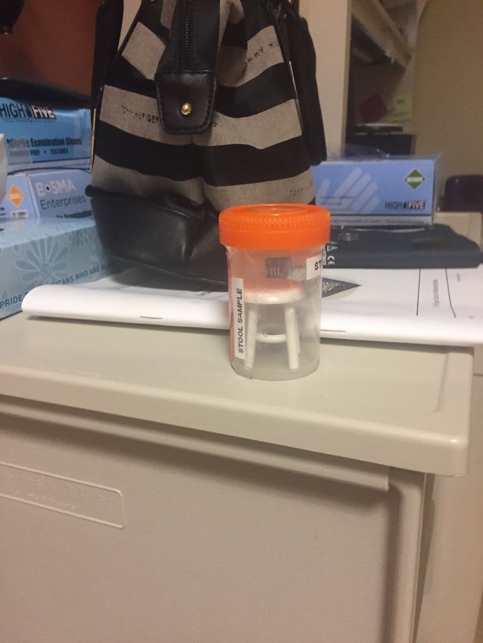 ▼「糞便樣本」盒中裝了小凳子。「STOOL」既有糞便的意思,也有凳子的意思。