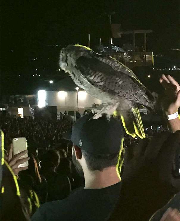 ▼演唱會上,一隻貓頭鷹落到了他的頭上。