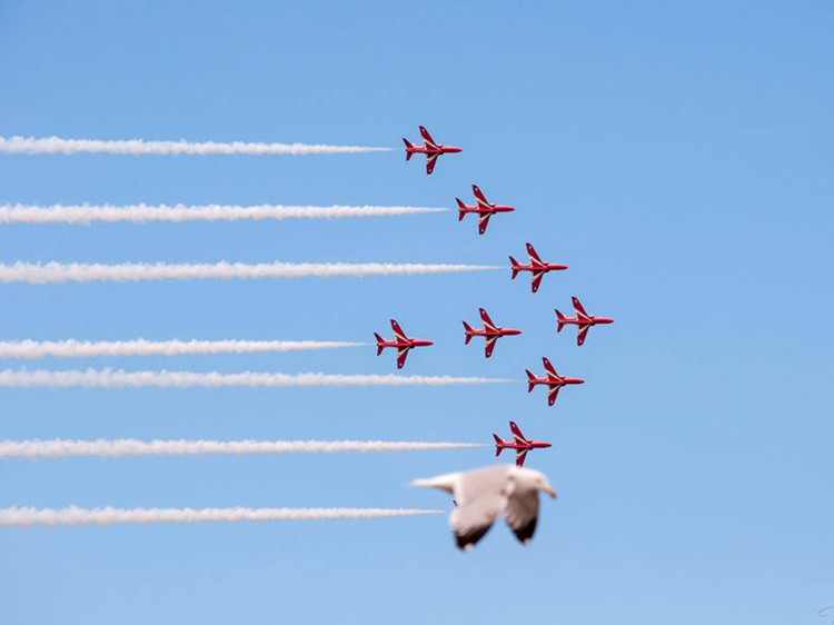 ▼一隻鳥加入了飛機的隊伍,牠的身後還有雲的痕跡呢。
