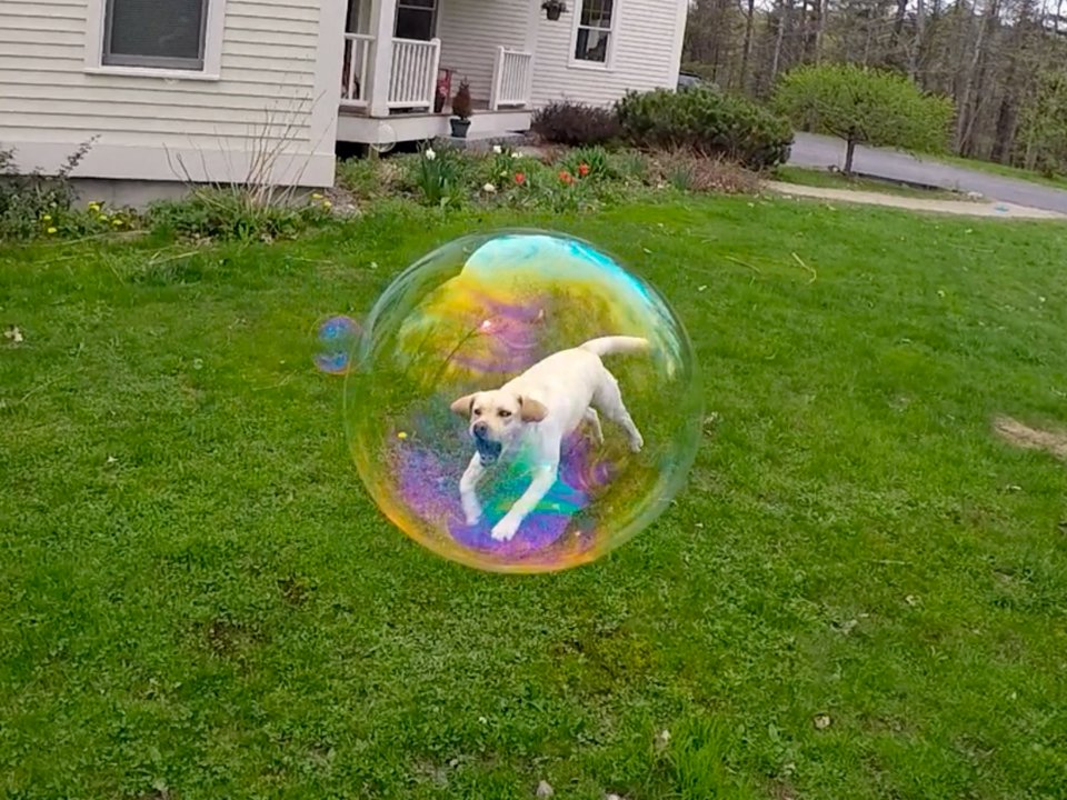 ▼狗狗被困在泡泡裡啦,快救牠啊。