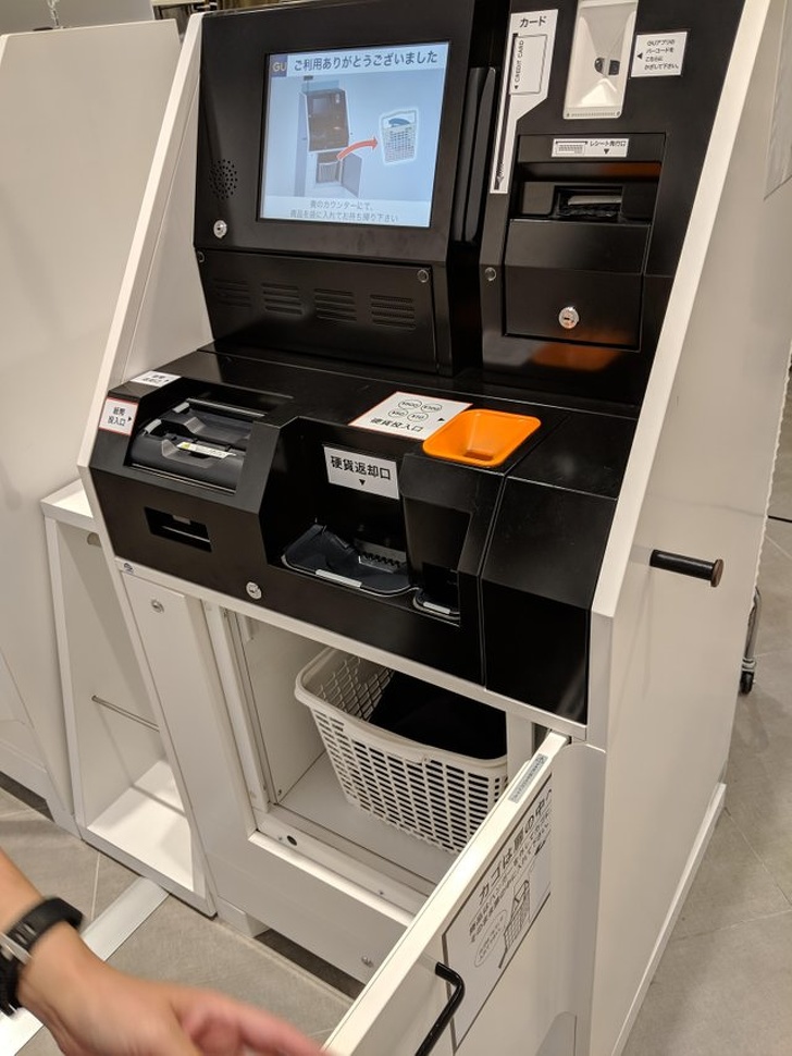 ▼將籃子放進機器下方,就能夠自動結賬、打包商品!