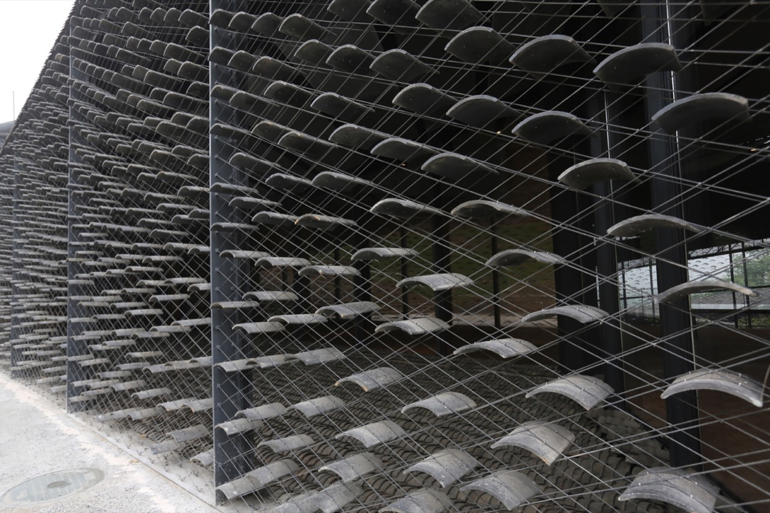 中國美術學院民俗藝術博物館用了來自當地傳統房屋的舊瓦片打造,外牆用不銹鋼索鉚固定瓦片,既有古典之美,又精妙奇巧。