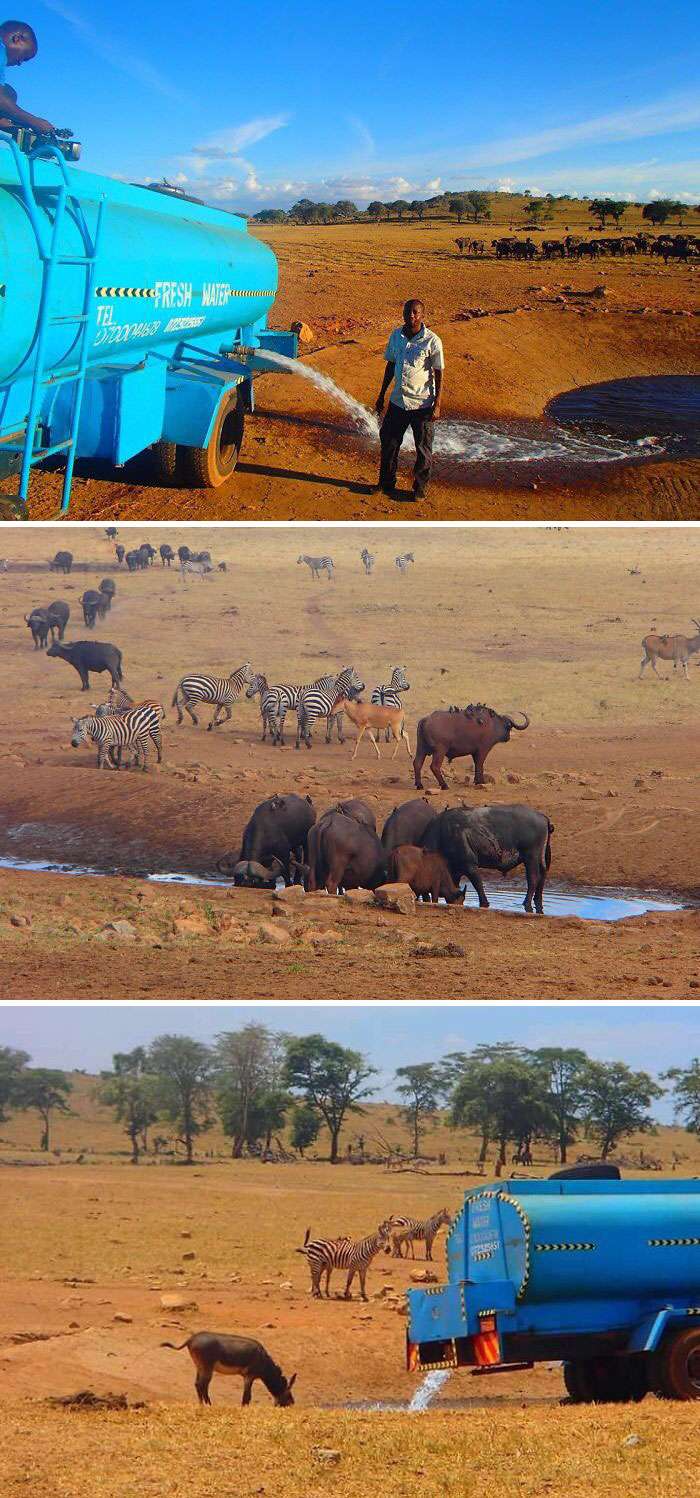 ▼旱季時,這名肯亞男子每天都開車去給野生動物送水。