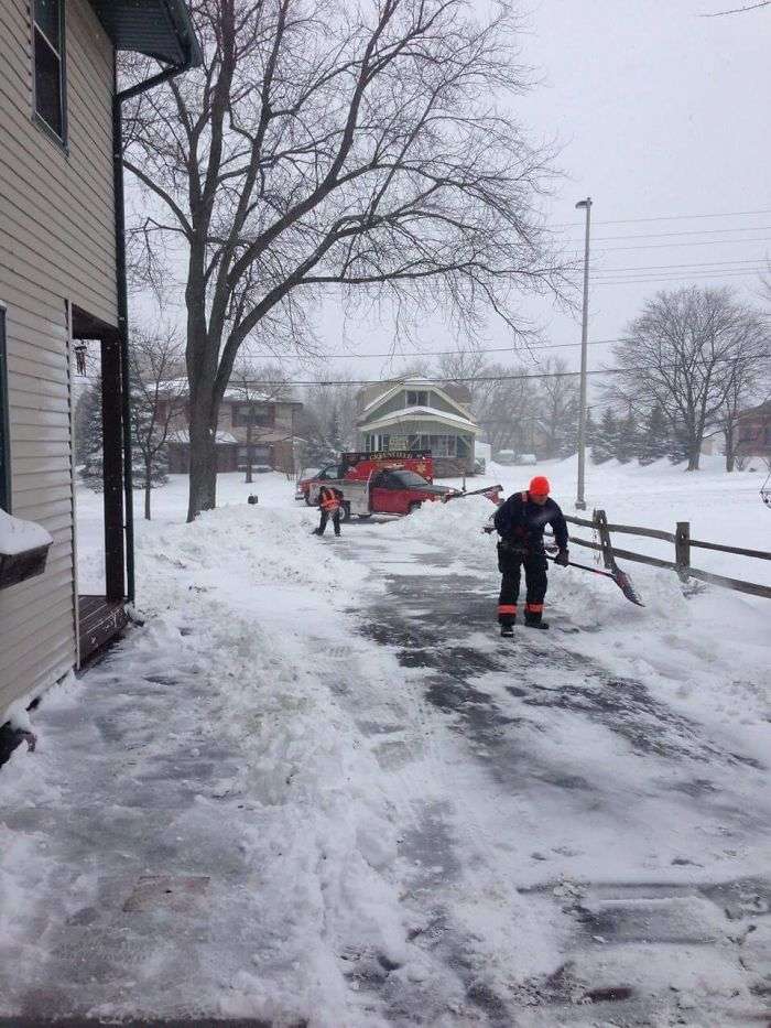 ▼老人入院治療了,醫護人員幫他清理車道上的積雪。