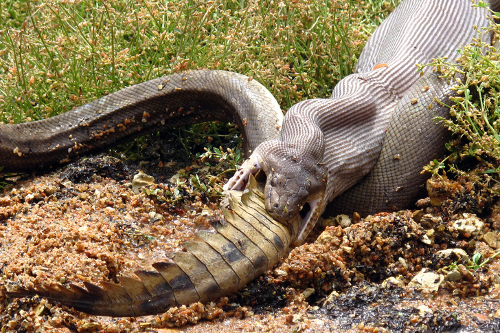 ▼吞下鱷魚的蟒蛇: