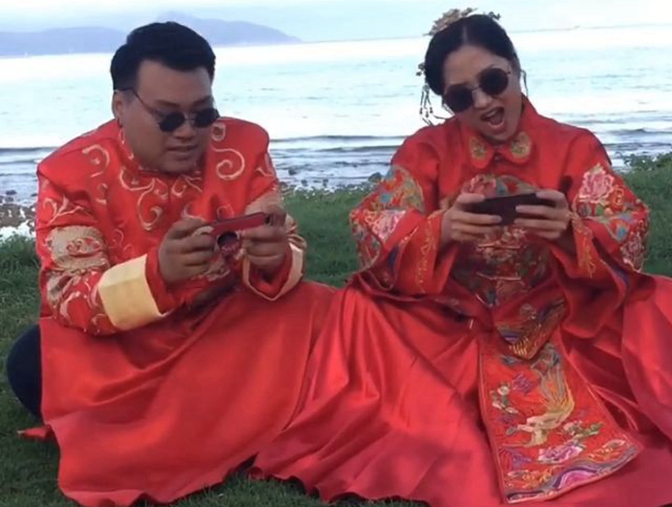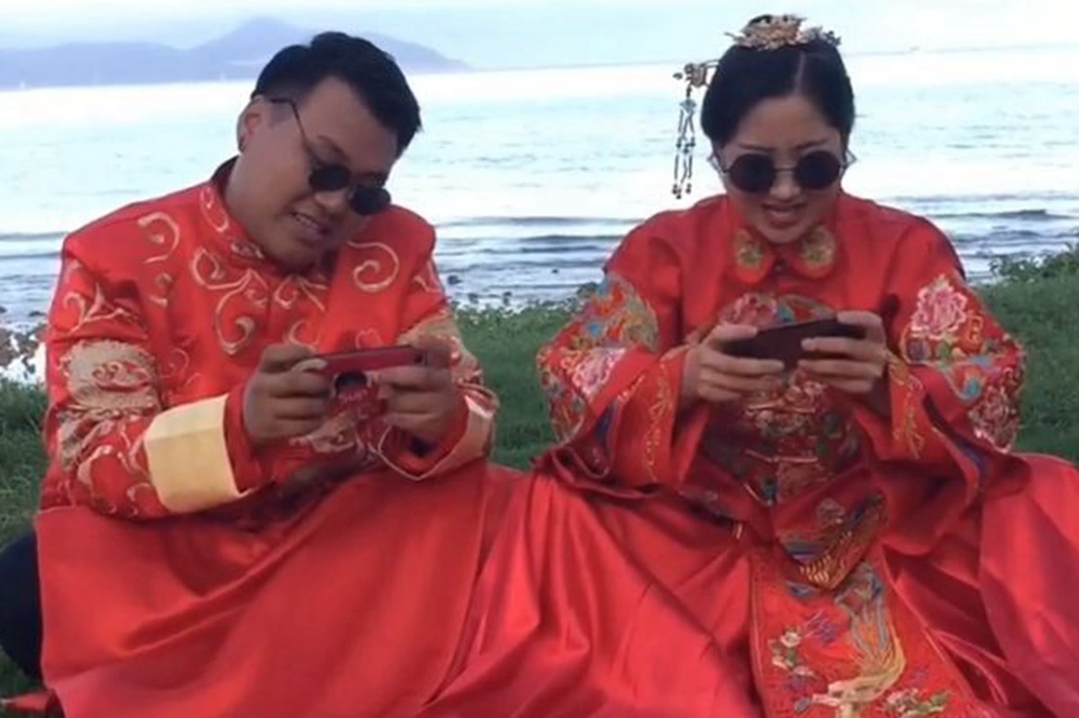 ▼這對新人是通過玩遊戲認識的,後來發展成為了現實中的情侶,現在終於要步入婚姻的殿堂。兩人興致勃勃拍婚紗照,拍到一半覺得太累,就決定休息一下,還拿出手機玩了起來。