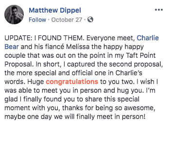 2018年10月31日10月初,一名男子在美國加州優勝美地國家公園的懸崖上單膝跪地,向女友求婚的場景,偶然被攝影師Matt Dippel拍了下來。照片中那對情侶沐浴著橙色的陽光,看起來超浪漫。Dippel將照片po到網路,懇請網友協尋照片主角,現在終於有好消息了。