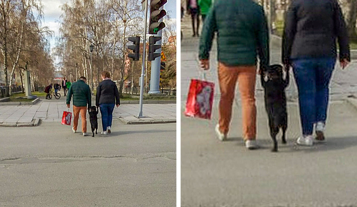 ▼他們牽著狗狗過馬路,好像一家三口。