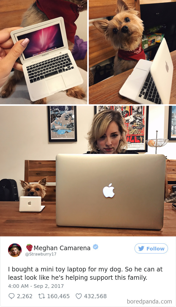 ▼為了讓狗狗看起來也為這個家做了一份努力,主人給它買了一個玩具的筆記型電腦,這樣就能和主人一起工作啦!