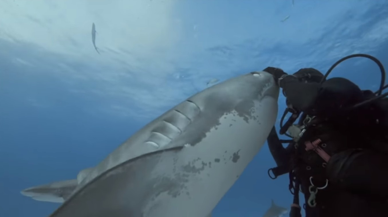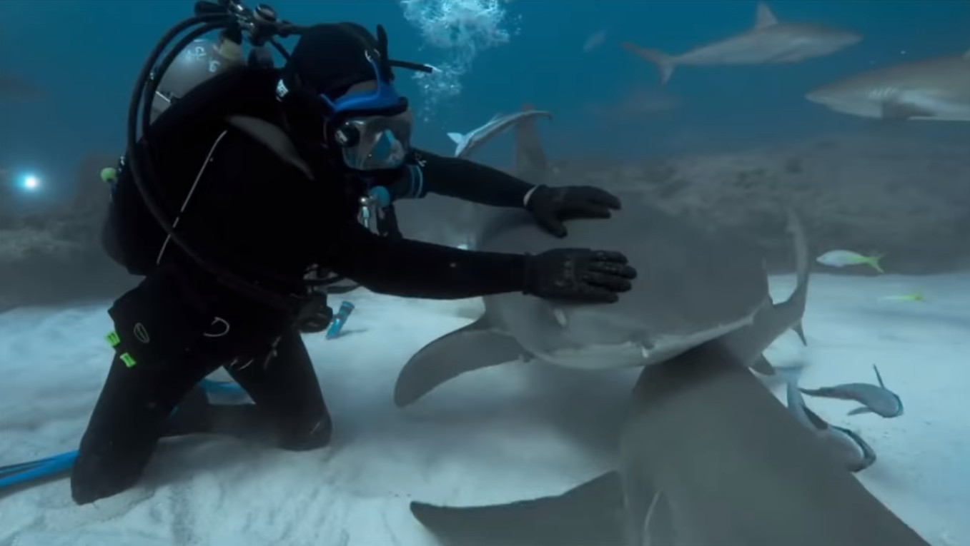 ▼潛水人員在確定牠們沒有攻擊意圖後,也開始跟這些前來「撒嬌」的虎鯊們互動了起來。