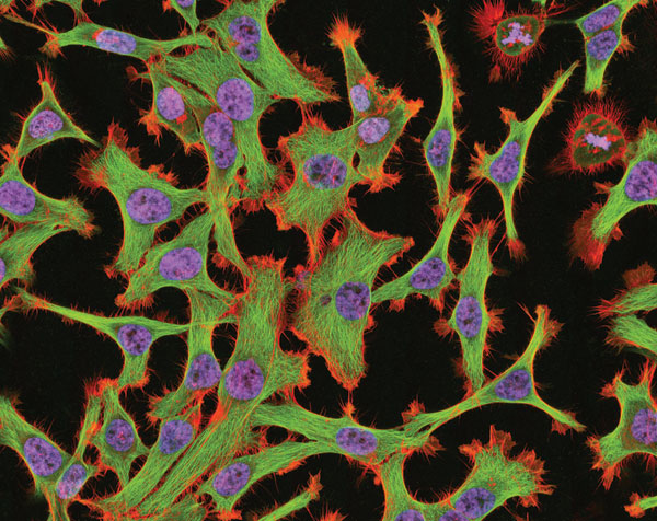 ▼海拉細胞由正常細胞癌變得來,具有錯誤填充的基因組。正常人體細胞中含有46條染色體,而經過突變的癌細胞染色體數目多達76~80條。這是因為基因組中出現未檢測到的細胞分裂時發生錯誤累積。它們異於常態細胞地表現為增殖速度激增,同時在人體內逃避了細胞凋亡。