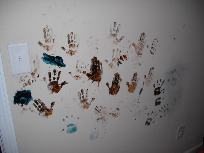 ▼​有手印的牆壁更好看,爸爸媽媽不這樣覺得嗎?