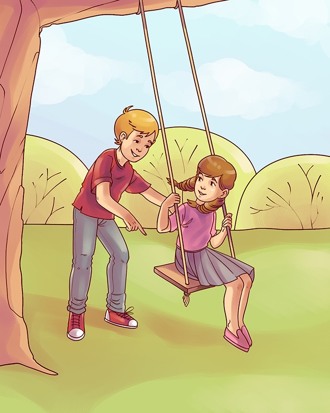 ▼盪鞦韆的男孩和女孩。