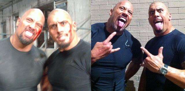 ▼巨石強森用過好幾位替身演員,但與他最像的還是他的表弟諾伊·里德(Tanoai Reed)。2002年時,巨石強森在電影《魔蠍大帝》中第一次出任主演,就與諾伊合作,後來兩人還合作了《玩命關頭》系列。