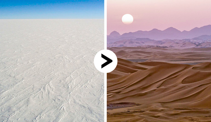▼世界上最大的沙漠位於南極洲:沙漠指的是幾乎沒有水、雨、雪,樹木或植物的乾燥地區。寒冷的地方也可以出現這樣的情況,所以面積足足有540萬平方英里的南極沙漠才是世界上最大的沙漠。撒哈拉沙漠只排第三名。