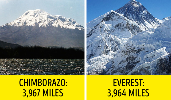 ▼珠穆朗瑪峰不是世界最高峰:從地球中心測量山峰的高度,欽博拉索火山比珠穆朗瑪峰高一點。欽博拉索火山是3,967英里,珠穆朗瑪峰則是3,964英里。 但測量海拔高度的話,珠穆朗瑪峰就高29,029英尺。 如果在地球中心測量各大山峰的高度,珠穆朗瑪峰甚至不會出現在世界上20大最高峰的列表中。