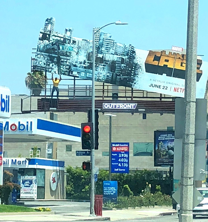 ▼14. 美劇「盧克凱吉」的宣傳!力量人直接舉起自己的廣告牌~
