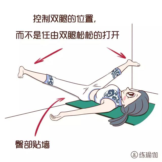 ▼仰臥坐角式:將瑜伽墊短邊放在牆邊,躺在墊子上,雙腿、臀部靠牆向上伸展。呼氣,雙腿慢慢向外打開適當的距離,雙手平展放在身體的兩側,保持4-6個深緩呼吸。