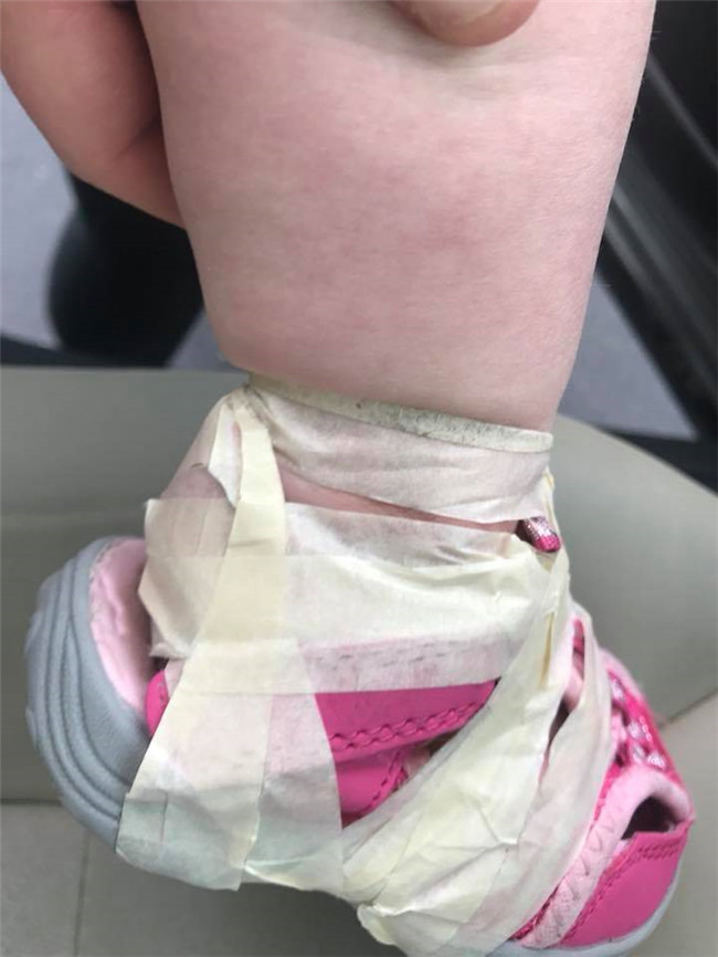 ▼從照片中可以看到,孩子的鞋子上纏了好幾層膠帶,並且還繞過鞋子在腳踝的皮膚上固定,明顯可以看到勒的很緊,別說媽媽看了很崩潰,誰看了都很揪心。