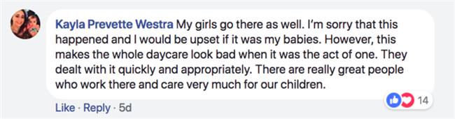 ▼海斯覺得自己應該把這件事公之於眾,雖然很多網友都表示了震驚,但也有一些人認為這只是一個偶發事件,不應該因為一個新員工的錯誤而讓公眾來抨擊這家托兒所,海斯說:「對於那些覺得我給這家托兒所抹黑了名聲的人,我只能說我的孩子出了問題,我應該為她發聲」。