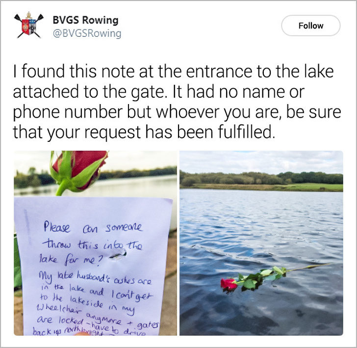 ▼「我在湖的入口處找到了一張字條,上面沒有名字或電話號碼。但無論你是誰,你的請求已經被滿足了。」字條:「有人可以幫我把這個放到湖裡嗎?我丈夫的骨灰在湖裡,但我因為坐輪椅的關係,沒辦法到湖邊。」