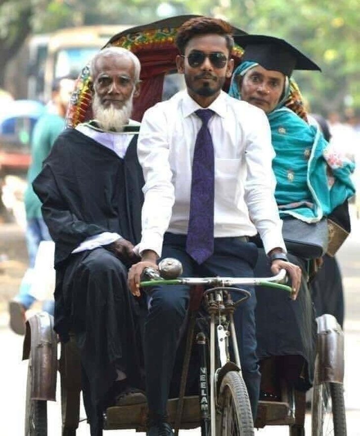 ▼這名工程學畢業生的爸爸是人力車夫。畢業那天他用人力車載父母回家。