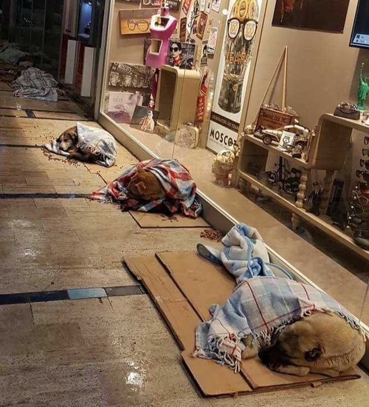 ▼暴風雪期間,伊斯坦堡人給流浪狗蓋上毯子保暖。