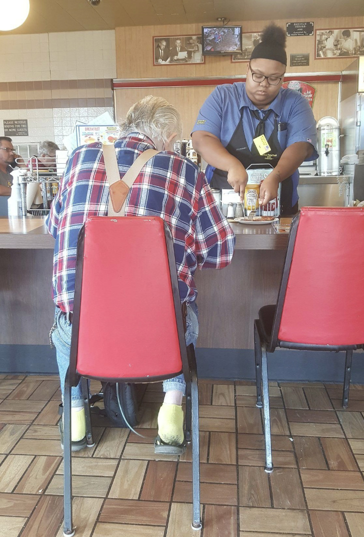 ▼這位老人沒力氣切火腿,服務生耐心幫忙。