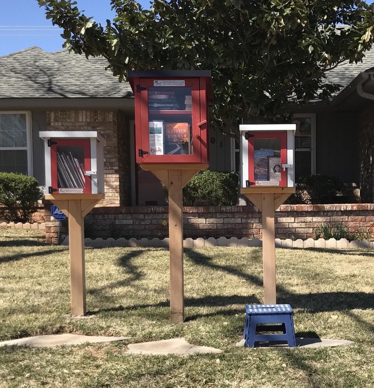 ▼鄰居設置了一個小型圖書館,社區裡的人都可以拿書來看。為了方便小朋友,他們還準備了一個墊腳的凳子。