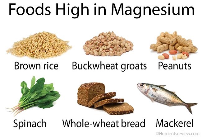 糙米、蕎麥、花生、菠菜、全麥麵包、鯖魚;此外還有堅果類、穀物、豆子、新鮮蔬菜和乾果、綠色水果、魚肉等等,都有豐富的鎂含量。