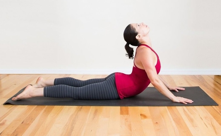 ▼眼鏡蛇式:趴在瑜珈墊上,手掌支撐於胸部兩側;雙手撐地幫助上半身抬離地面。停留15到30秒再休息。