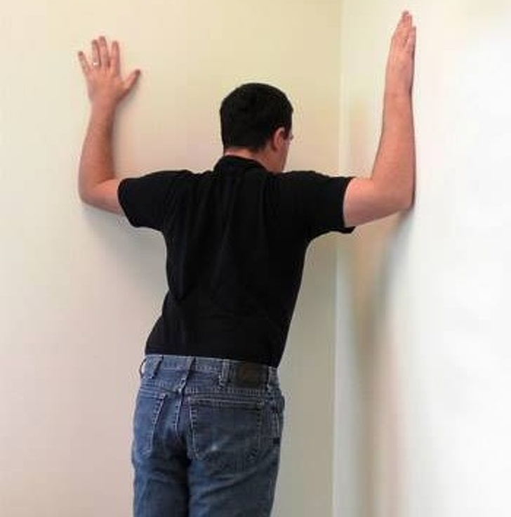 ▼牆角伸展運動:面對牆角站好,雙腳併攏,距離牆壁約60公分;前臂貼牆,手肘稍微高於肩部;身體向前傾斜,直到感覺肌肉有拉伸感為止。停留30到60秒再休息。