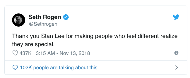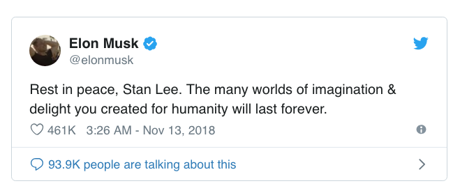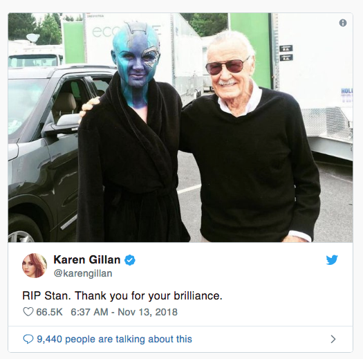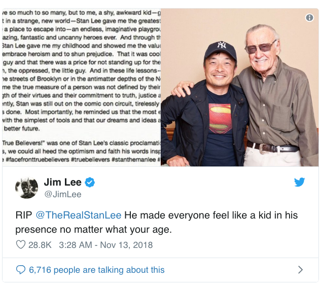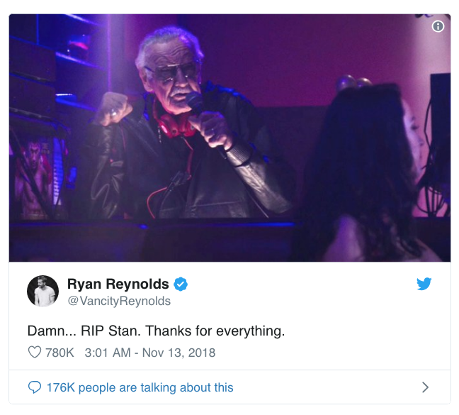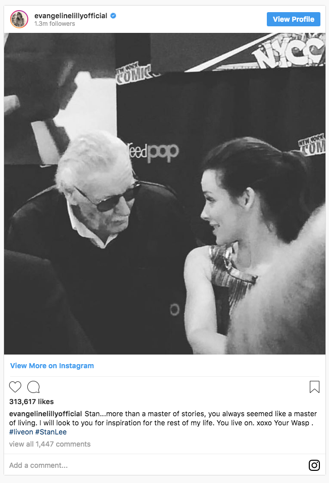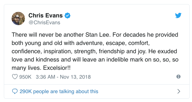 「這個世界再也不會有另一個史丹李了。幾十年來,他一直為各個年齡層的人提供了冒險、舒適、自信、啟發、力量、友情和快樂。他留下的愛和善良將會一直永存大家的心中!」