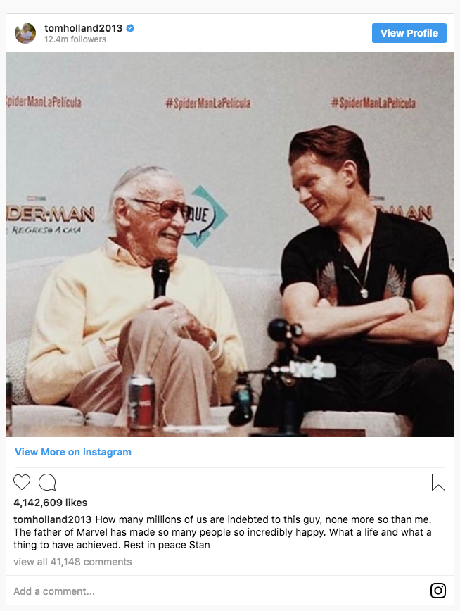 ▼蜘蛛人:「這個世界數以百萬計的粉絲都欠了這個男人,我也一樣。「漫威之父」帶給了很多人快樂。這是多麼偉大的成就和生活啊!」