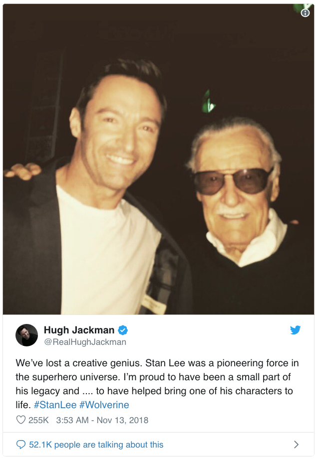 ▼金鋼狼:「我們失去了一位富有創意的天才。史丹李是整個超級英雄世界的先鋒力量。我很榮幸能夠成為這一部分,擁有珍貴的機會演活角色。」