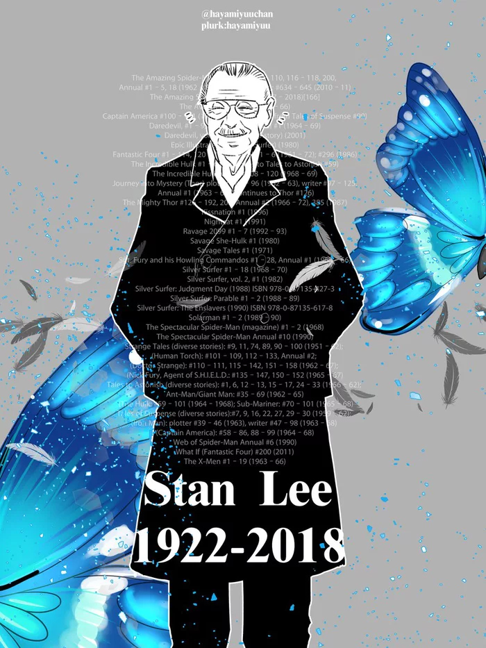 2018年11月14日漫畫界的一代傳奇史丹李永遠地離開了我們,但是他留給全世界的作品還會一直影響著每一個人。許多藝術家知道消息後,紛紛在最短的時間內畫出了致敬的作品,他老人家在天上看到有那麼多人愛著他,相信也會微笑著謝謝大家。