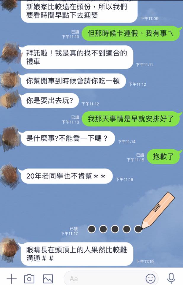 ▼連續好幾句「弟弟結婚」、「會請你吃一頓」、「不能喬一下嗎?」,但是原PO是真的有事,只能抱歉拒絕。沒想到對方下一句竟然是「眼睛長在頭頂上的人果然比較難溝通。」