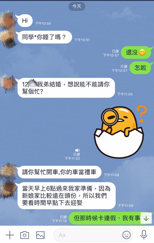 開好車的人一點也不容易啊!台灣一名開海神瑪莎拉蒂(Maserati)的男子受不了同學的酸言酸語,PO出LINE對話截圖,直呼「一個交情很不怎樣人要我去當禮車司機,從台北開去苗栗迎娶!重點我還不認識他弟」、「所以是我的問題?」。