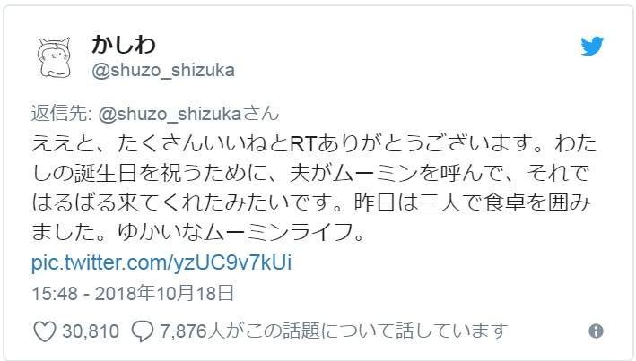 ▼​「謝謝大家的生日祝福。為了慶祝我的生日,老公特別叫來了嚕嚕米。昨天3個人一起吃了飯,真是愉快的嚕嚕米生活。」