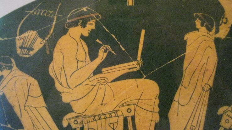 ▼還有這個古希臘時期的壁畫,那個坐著的人手中好像也拿著筆電,他的另一隻手上還拿著「觸控筆」呢。