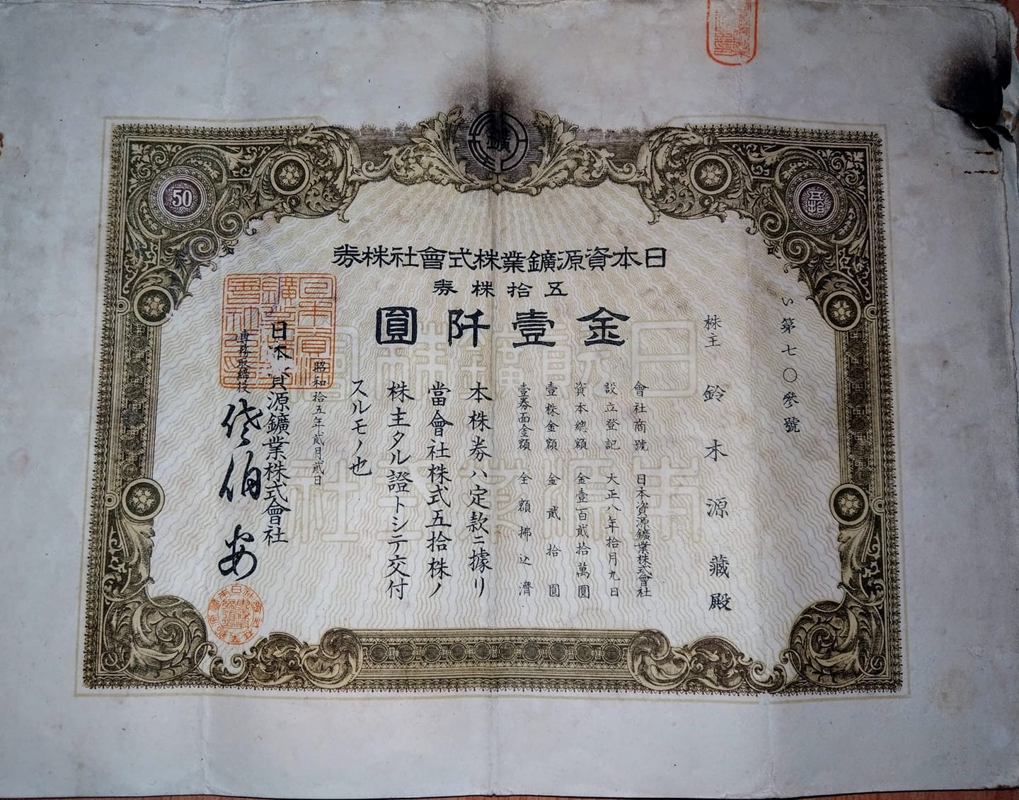 ▼從照片中可以看到,那是一張一千元股票,由日本資源礦業株式會社株券發行。發行的時間是昭和15年,也就是1940年。這張股票保存得很好,上面的字清清楚楚,連圖案都沒有損毀。